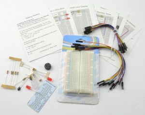The Raspberry Pi Electronic Starter Kit contains all the components you need, together with easy to follow instruction cards, in order to complete 10 simple experiments involving LEDs, thermistors, photoresistors and switches and is an ideal starting point for anyone new to electronics and the Raspberry Pi.